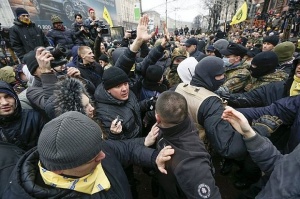 Митингующие, которые пытались прорвать кордон на улице Грушевского, разбили два милицейских автобуса. Как сообщает УНИАН, потасовку с милицией инициировали сторонники организации „Правое крыло". Столкновения продолжаются и в настоящее время.